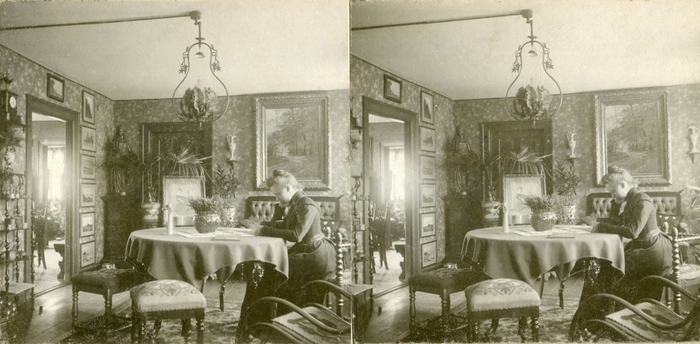 Ellen Arnholtz læser i stuen, ca. 1895-1919, fotograf: Arnholtz