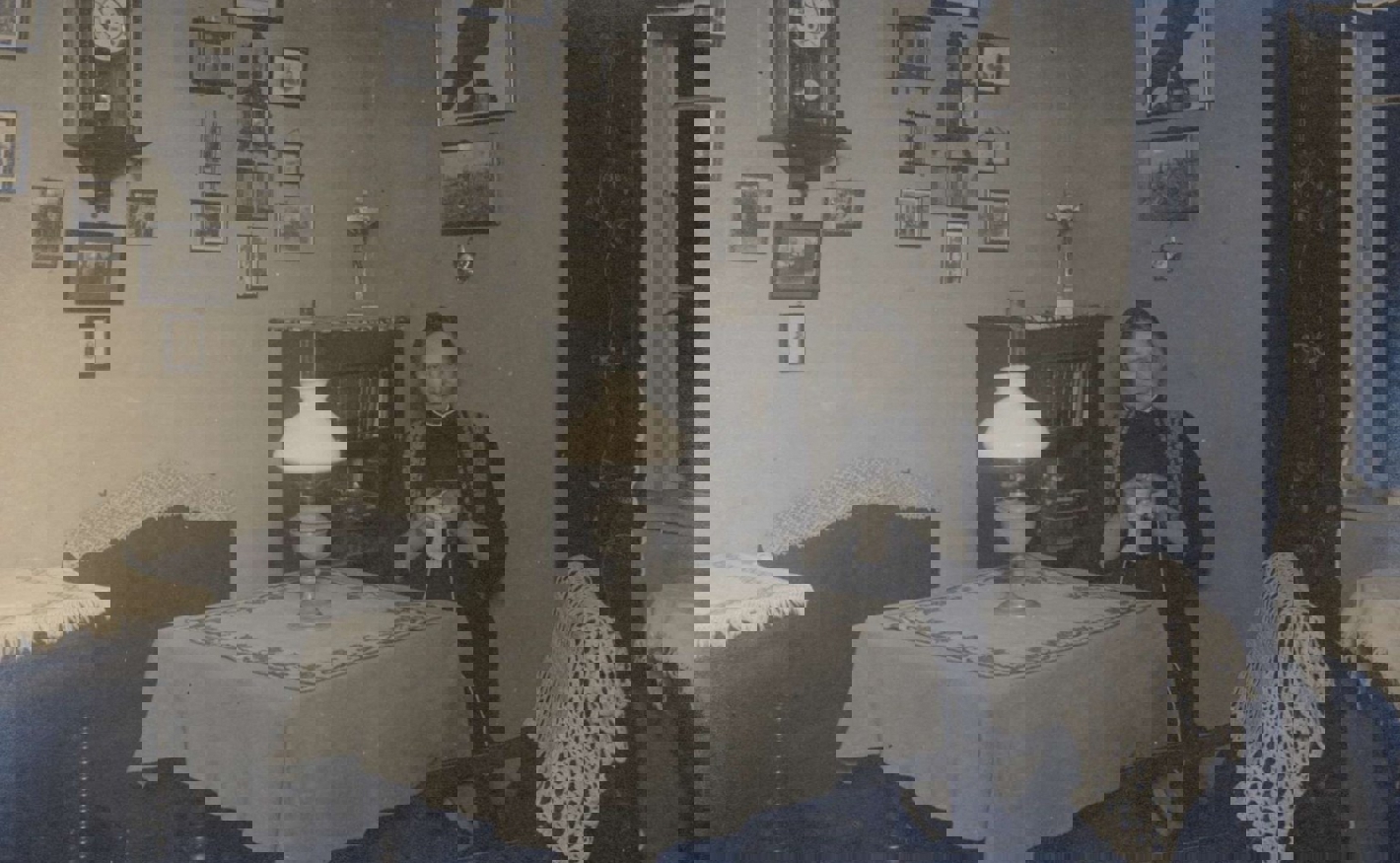 Jomfru Hanne Larsen strikker strømper til lemmerne på Kanalgården, 1920. Fotograf: Ukendt.
