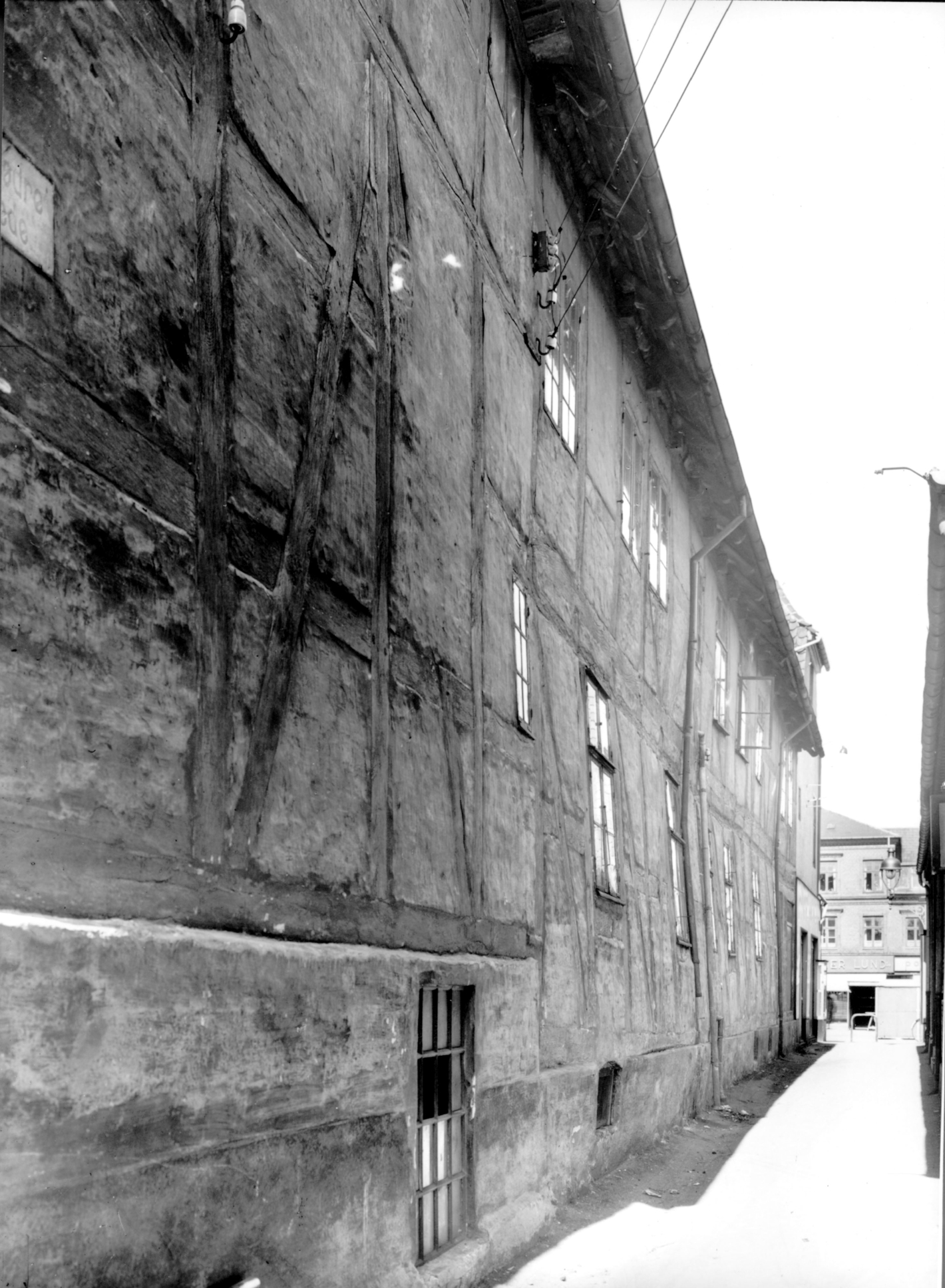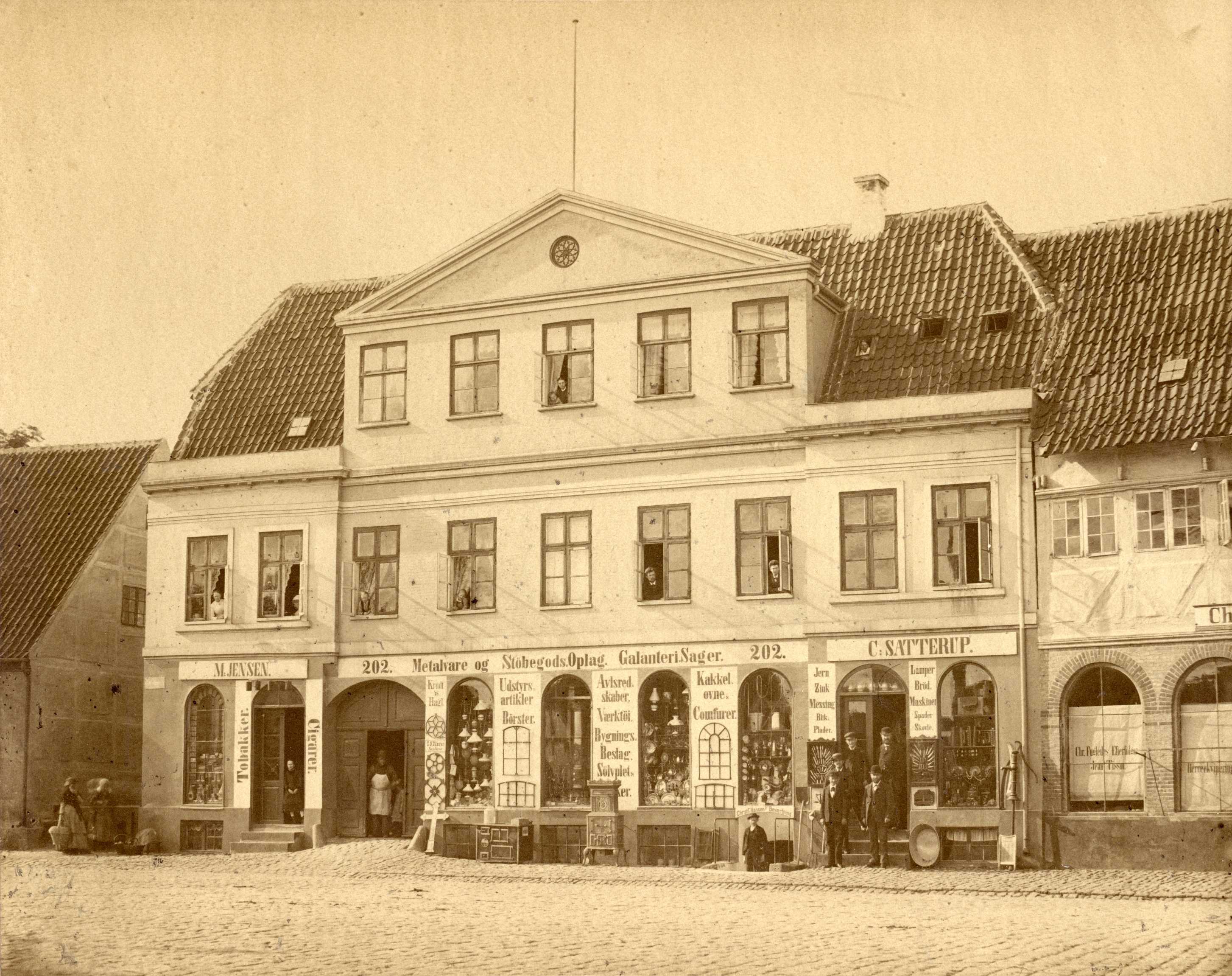 2007.262-4 Hjørnet af Gråbrødrestræde, kaldet Pølsen, Sct. Peders Kirkeplads 7, ca. 1920-1930. Satterups Gård blev solgt i 1949 og revet ned. Bindingsværksbygningen er genopført i Den Gamle By i Århus. Fotograf: Emanuel Arnholtz