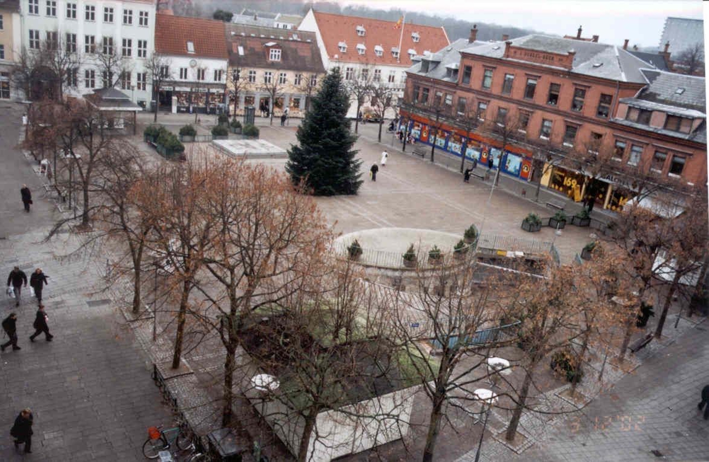 12577 Axeltorv set fra oven med juletræ. Bag ved træerne i forgrunden af billedet kan man se hvor parkeringskælderen ligger. 2002. Fotograf: Næstved Kommune